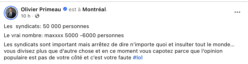 Dans la rue pour leur petit nombril! C’est même pas pour le droits des travailleurs, c’est pour le droit que les syndicats continuent de vous cacher se qu’ils font avec vos cotisations!!