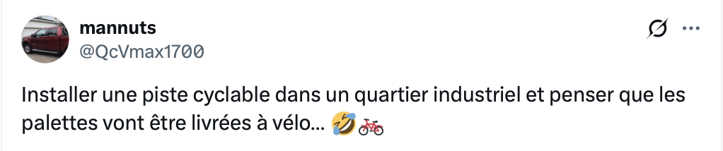 C est bizarre quand c est le camion bixi qui bloque la piste cyclable ca dérange pas trop par exemple, mais un camion de livraison ohhhh !!! scandale
