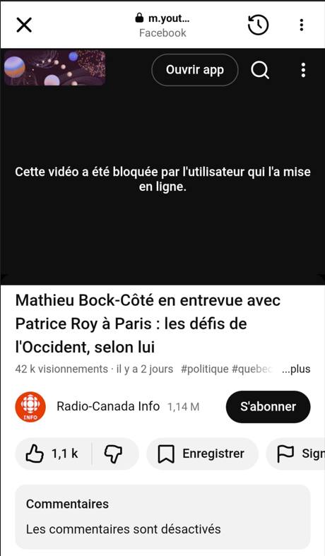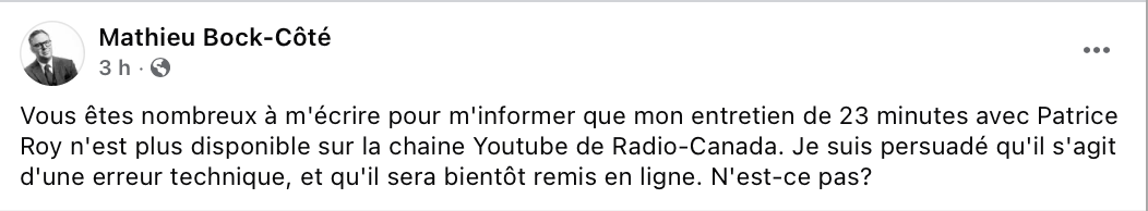 « Radio-Canada a retiré l’entrevue à ma demande; car on y voit clairement que je suis un vendu fédéraste complètement dépassé par les évènements. » – Patriss E Roy, collabo au grand remplacement