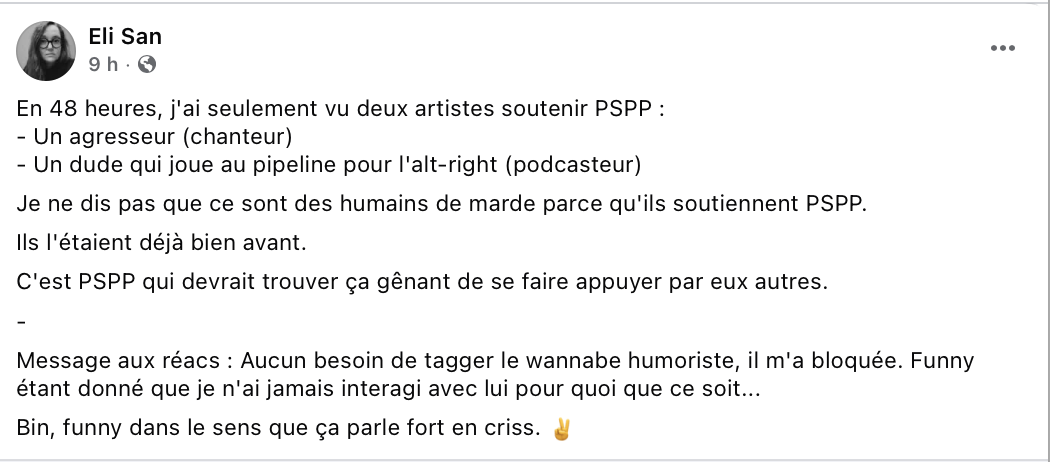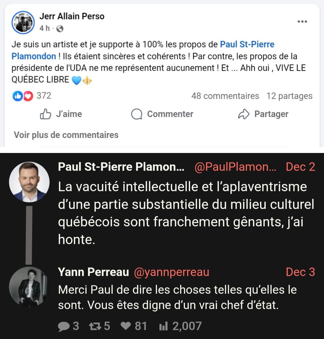 « Les artistes québécois sont des putes qui s’offrent aux plus offrants. Et le fédéral est le big Sugar Daddy de nos gratteux de guitares systémiques. » – Pierre Lefardeau