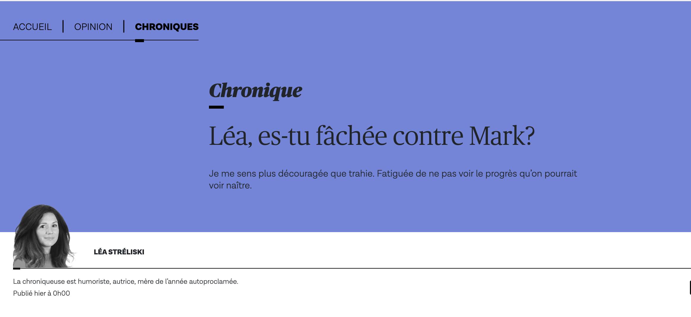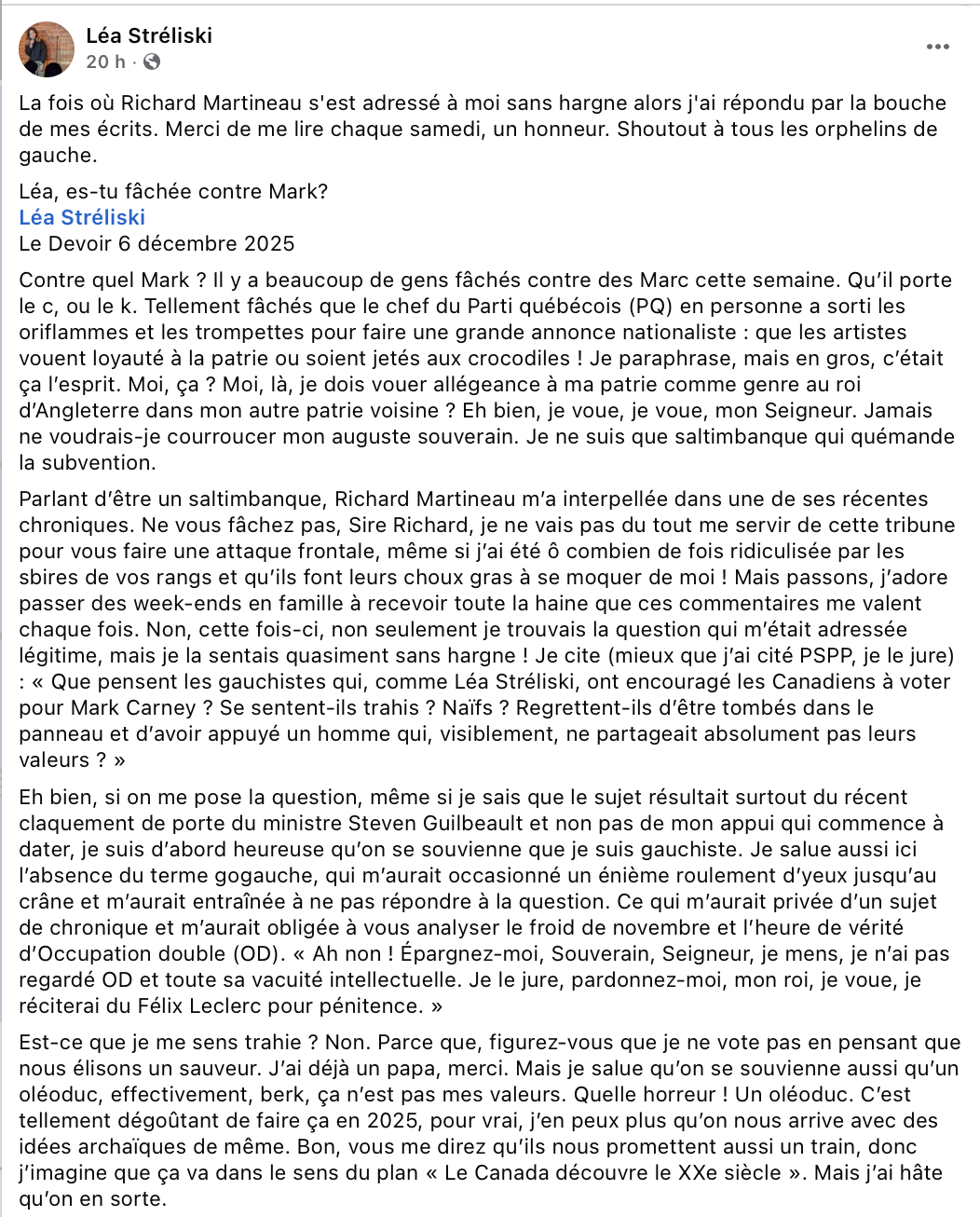 Sa chronique est, en effet, de peu d’intérêt. Mais au contraire, dans Le Devoir, la section des commentaires sous cette même chronique est beaucoup plus relevée. On y voit plusieurs lecteurs allumés qui ont remonté les bretelles de Léa de manière assez délectable.