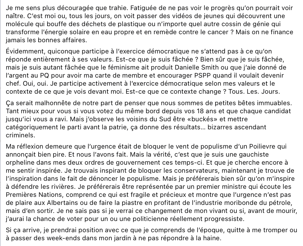 Si tu as des vrais principes progressif, et dans ton cas, c’est géométrie variable, ca dépend où $$$ la mène, tu aurais dû militer au NPD, voire même le Bloc, pas mal plus progressif que le PLC.