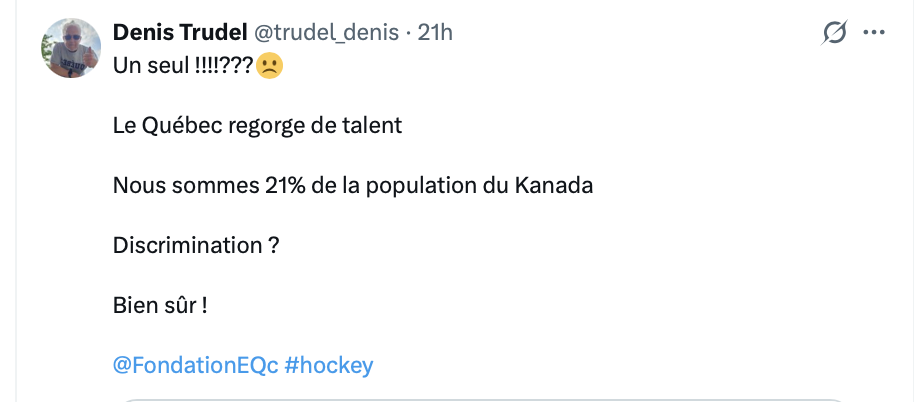 Selon la logique de l’ivrogne nationaleux, environ 20% de la population du QuĂ©bec est immigrante, donc il devrait y avoir 20% de joueurs immigrants dans l’Ăquipe QuĂ©bec.