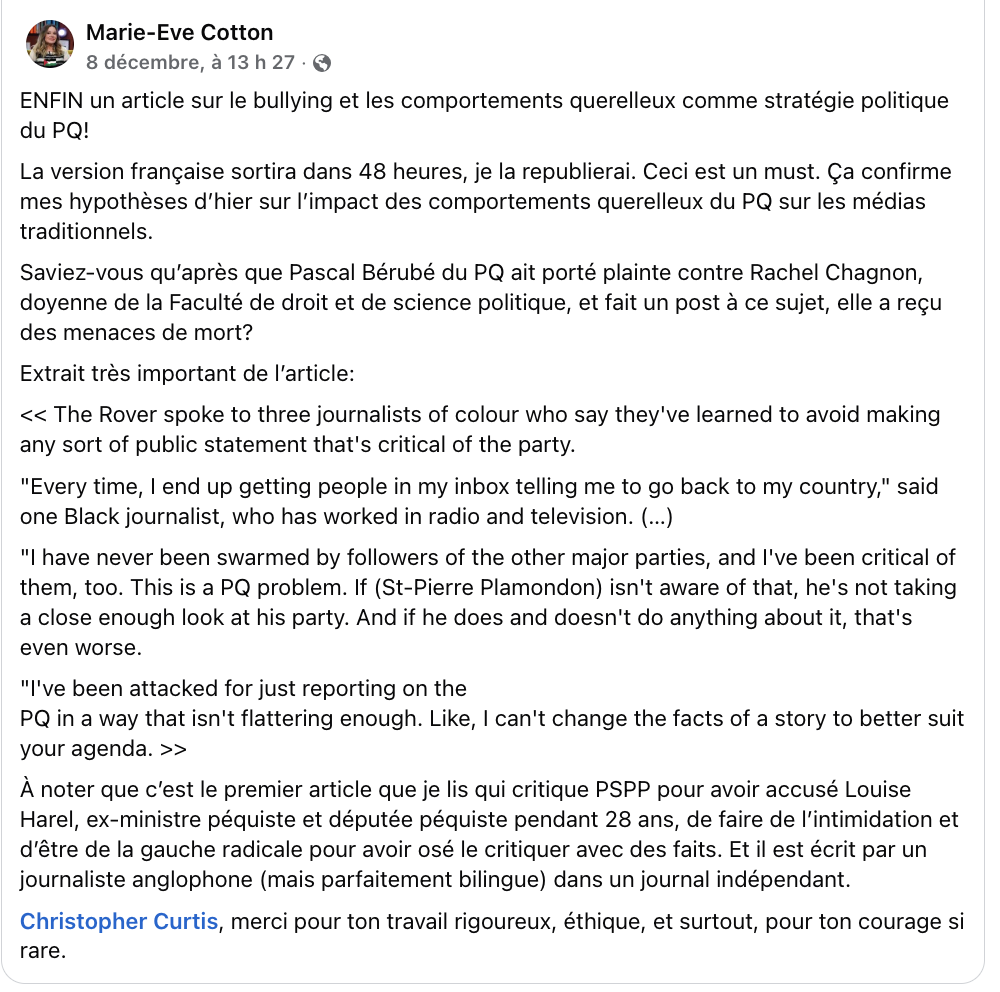 Curtis (anciennement à The Gazette toujours en train de mépriser les francophones) est une plaie pour la société. Dans son article, il accuse notamment Pascal Bérubé et Guy Nantel de bullying pour avoir publiquement dénoncé les propos de la rectrice de l’UQAM qui avait comparé le PQ au nazisme. Faut-tu être un moyen crétin? Pas sûr que le woke à Curtis aurait eu le même propos si quelqu’un comparait les méthode de QS à celles de Staline.