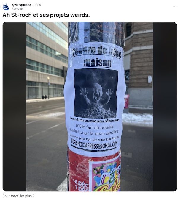 Thanks but no thanks… Vendeur??? 😂😂😂😂😂 Commentaire inutile à m’envoyer: combien? Navigation des articles ← La fefille dans la tempête qui aimerait venir… d’ailleurs! T’as pas de secondaire 1? Pas grave on t’engage quand même! → Label Nom* E-mail Label Nom* E-mail 13 Commentaires Commentaires en ligne Afficher tous les commentaires Ça absorbe en sacrament, 4 ingrédients seulement. 19 heures il y a Un mélange 100% naturel de talc, de silice, de benzène et de plomb. Penaten 19 heures il y a Que ce soit vrai ou une joke, dans les deux cas c’est weird. Ramon Ecobar 19 heures il y a Moi aussi je vends de la poudre maison. André Boisclair 11 heures il y a Répondre à Ramon Ecobar Ha oui? lebeau 18 heures il y a on peut la sniffer La fefille en télétravail 18 heures il y a Répondre à lebeau J’en suis sûre Mononcle chaudasse dans un rare moment de lucidité 18 heures il y a Des bébés sua poude ! Ça commence jeune ! BURP ! Le Philosophe 17 heures il y a Répondre à Mononcle chaudasse dans un rare moment de lucidité Une chanson cochonne mononcle, une chanson, une chanson ! Mononcle chaudasse dans un rare moment de lucidité 16 heures il y a Répondre à Le Philosophe Connais-tu la p’tite grenouille ? https://www.youtube.com/watch?v=pdsPHs9oDaM&list=RDpdsPHs9oDaM&start_radio=1 Le Philosophe 18 heures il y a Bon scuser, scuser… J’avoue il s’est évadé de montréal. C’est un de nos artistes un peu étrange et pas connu de personne. Il fait ses affaires, il y a un sens mais « faut le savoir ». Il dénonce les effets de la cocaïne sur les bébés. ceci explique cela 16 heures il y a ecrismoicapresse.com Pas sûr que c’est vraiemnt de la poudre pour bébé qu’il vendes Ben non! 14 heures il y a Répondre à ceci explique cela C’est pas de la poudre POUR bébe… c’est de la poudre DE bébé. Du bébé en poudre. N’ajoutez que de l’eau! Detecteur de fausse vertu 14 heures il y a Apres les pizzerias …. les conspis ne lachent pas le morceaux .