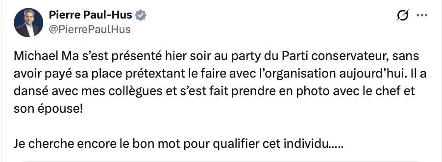 Le parti communiste chinois n’a sûrement rien dit à Monsieur Ma concernant ses valeurs politiques profondes qui mettent la parti de Trudeau père (jadis l’un de deux innocents en Chine rouge…) Chrétien, Trudeau fils et maintenant Carney à un député d’un gouvernement majoritaire… non-élu…
