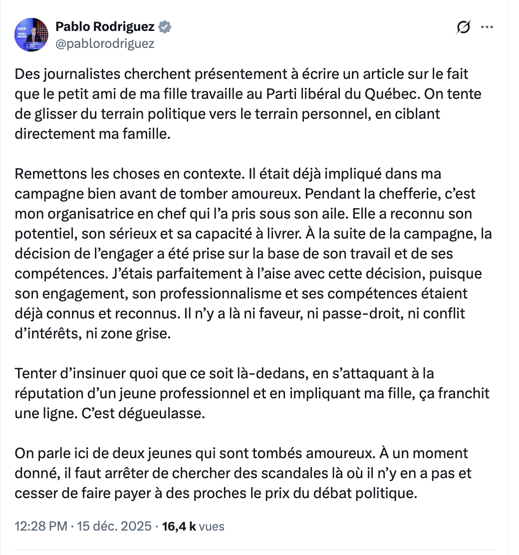 Parfait mon Pablo. C’est comme ça que ça commence justement les affaires de corruption. Un ami de mon ami qui est en amour avec ma fille qui a eu un contrat et qui va avoir une job après à temps plein dans un organisme gouvernemental. Pas de jugement une seconde.