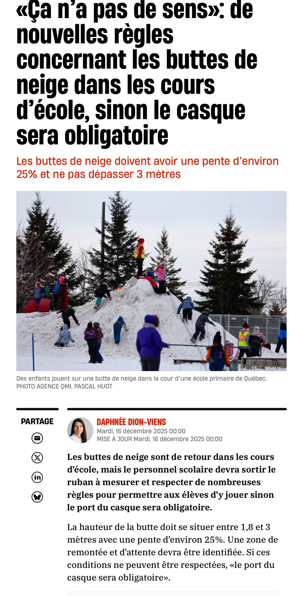 Quoi ? J’ai lu l’article et je n’arrive pas à y croire. Un croisement entre Croc et le Journal de Mouerréal. Ça fera pas des enfants forts. Le problème c’est les adultes pas les buttes de neiges.