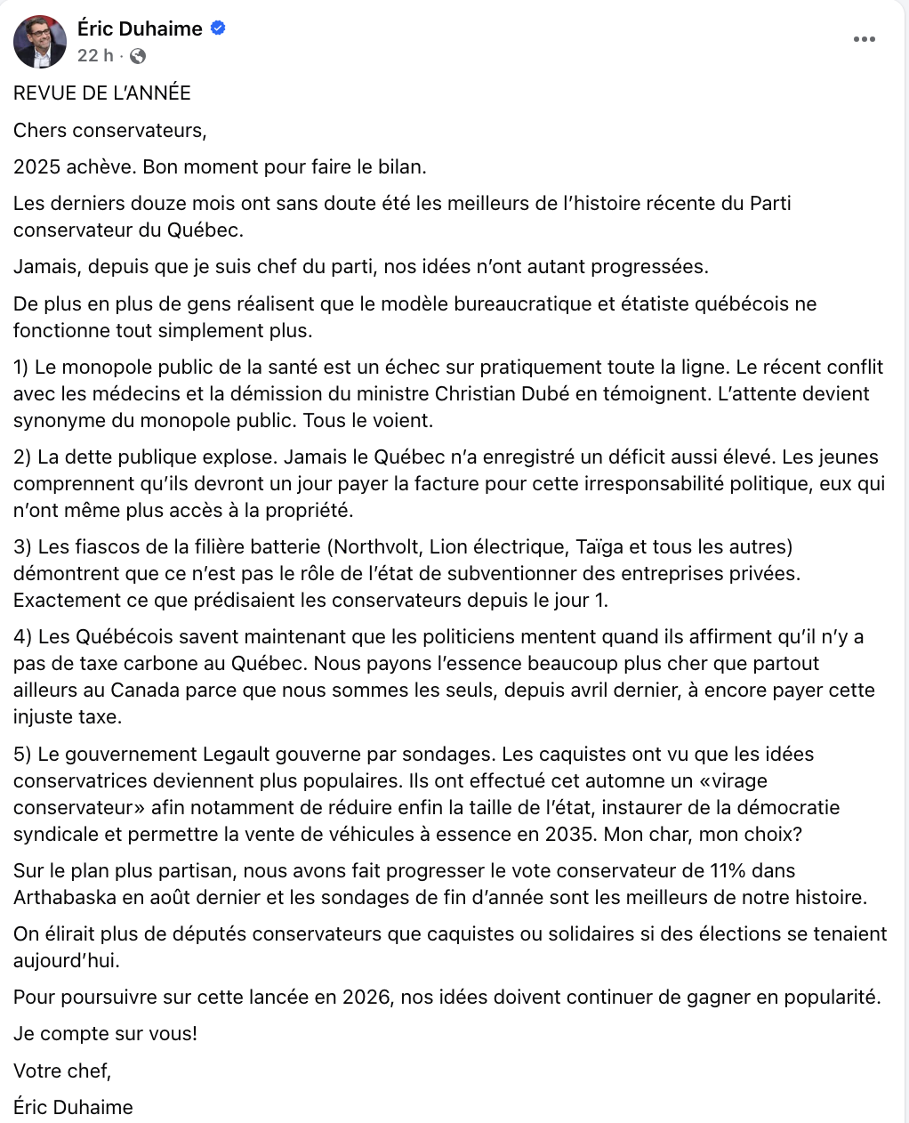 Cette pub ne pognera pas beaucoup chez les anglos qu’il courtise avec des publicités « No Referendum with the Quebec Conservative Party » dans le Globe And Mail et le National Post.