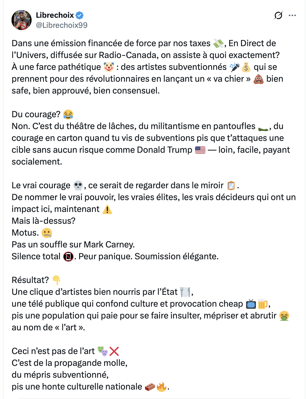 À une farce pathétique 🤡 : des artistes subventionnés 🎤💰 qui se prennent pour des révolutionnaires en lançant un « va chier » 💩 bien safe,… pic.twitter.com/qAcdxyDFEM— Librechoix (@Librechoix99) January 2, 2026