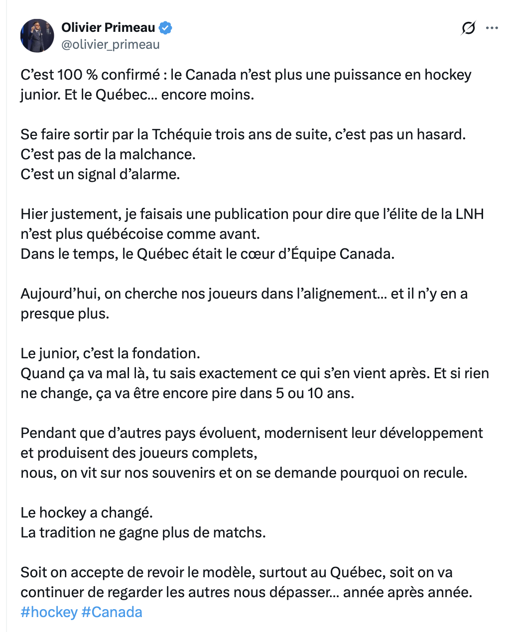 Encore une publication ridicule de m. Poutine congelé. Il dégueule sur le ECJ, il admet ensuite que tout les autres pays s’améliorent. Est-ce qu’il a au moins regardé un match du tournoi? Est-ce qu’il sait qu’ECJ a remporté le bronze. Il fini ça en beauté avec une petite dose de vomi sur le modèle québécois. Quand le vomi est plus important que le message…