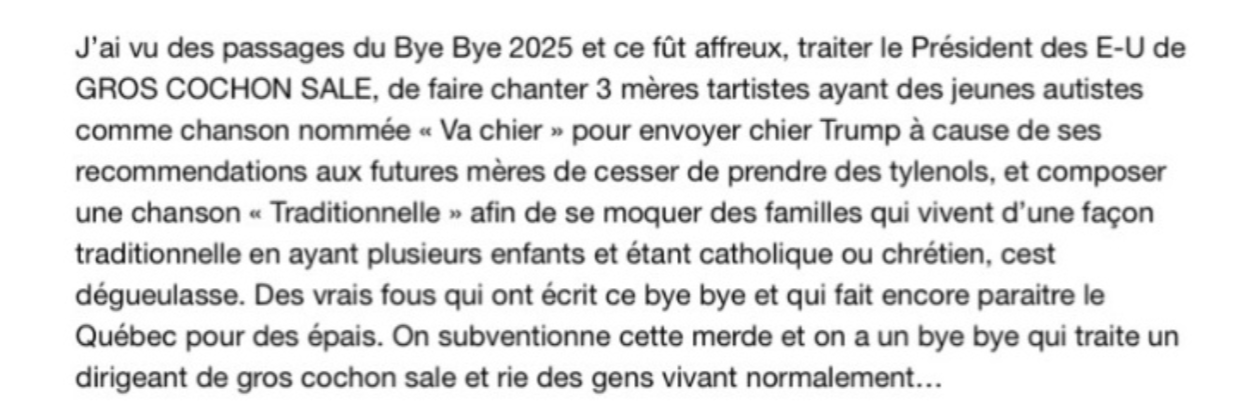 « Nous on a trouvé que c’était un des meilleurs Bye Bye, frisant le chef-d’oeuvre! Un gros merci à notre grand premier ministre Carney pour son généreux $150 millions à Radio-Canada, en toute impartialité. » – Patride E. Roy, Mabourion et Jean-René Dufaurt
