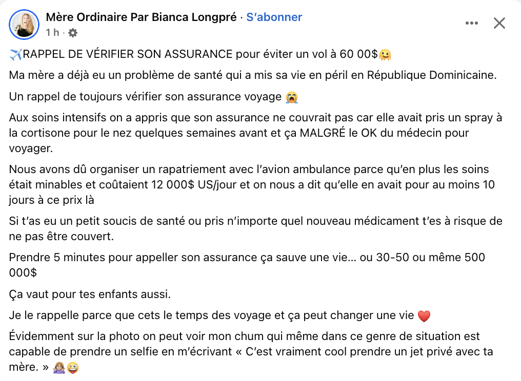 Elle aurait debourser 60 000$ pour des soins non couvert en 10 jours , un vrai vol selon elle . Alors elle a ORGANISÉE un volambulance de retour pour sa mere . Elle va surement recevoir des dons pour la belle tournure de phrase de la part des matantes qui pensent qu elle s est ruinée.