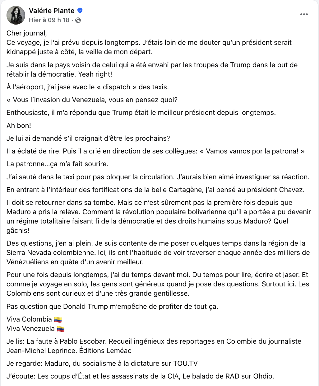 Ah, et il n’y a pas eu « d’invasion ». À l’heure actuelle, aucun soldat américain ne de trouve au Venezuela. Mais bon, allez expliquer ça à Valérie…