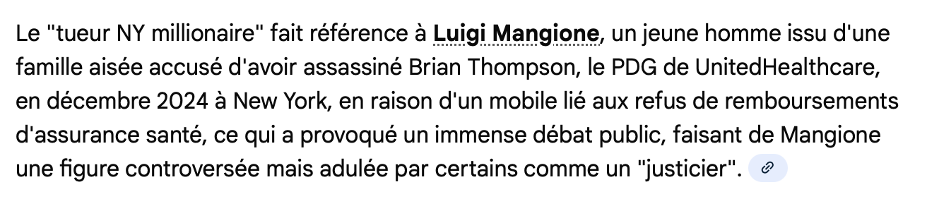 Luigi Mangione s’en ait pris à ce pdg n’ont pas à cause de sa fortune personnelle, mais en raison du fait que c’est un PDG d’une compagnie s’assurance médicale. Aux États-Unis, des gens paient pour une assurance médicale, mais la journée où tu en as de besoin, il arrive que ces compagnies trouvent tout plein de raisons pour ne pas payer ou bien ne pas couvrir certains traitements. Mangione est peut-être un type qui a été frustré qu’un de ses proches n’ait pu avoir accès aux soins prévus par l’assureur. Bref, un geste de frustration