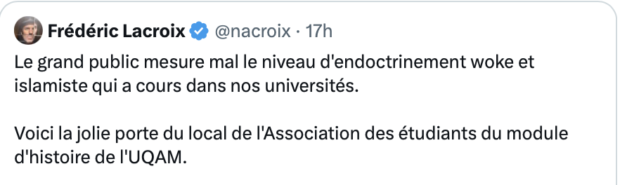 Le Québec n’existe pas, le canada n’existe pas mais la Palestine, criss qu’elle existe. Bande de tarés!!! Dire que ce sont eux qui vont prendre soin de nous plus tard.
