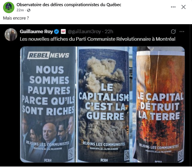 J’aime les nouvelles affiches du Parti communiste! 😂😂😂😂 Commentaire inutile à m’envoyer: j’en veux! Navigation des articles ← Bye Bye! Émilise Lessard-Therrien sur le départ de Legault! → Label Nom* E-mail Label Nom* E-mail 28 Commentaires Commentaires en ligne Afficher tous les commentaires Jack Off 6 heures il y a Elles ne sont pas nouvelles. Je les ai vu l’été passée près du Cégep St-Laurent, terroir communiste. Colonel Moutarde 6 heures il y a Être communiste en 2026 est l’équivalent d’avoir été lobotomisé. Stephane Gaudette 2 heures il y a Répondre à Colonel Moutarde Encore plus drole les  » capitalistes » de ton genre ….Vous avez meme pas de capital Aweille va travailler osti d’pauvre Colonel Moutarde 1 heure il y a Répondre à Stephane Gaudette Haha! Je peux t’acheter et te relouer à rabais. Remarque que c’est pas difficile, tu vaut pas une cenne, la raclure. Bobos fragiles 1 heure il y a Répondre à Colonel Moutarde Sergaz a été lobotomisé, mais il est circoncis. Est-ce que cela compense ? Karl-Marx Péladeau 6 heures il y a Slogans simplistes qui font appel aux émotions négatives, comme la jalousie, et à une intelligence assez faible. Stephane Gaudette 2 heures il y a Répondre à Karl-Marx Péladeau Ouais faut etre jaloux de vouloir se loger et manger Colonel Moutarde 1 heure il y a Répondre à Stephane Gaudette Cry me a river. Ceux qui travaillent et mangent ont du mérite. Va étudier et arrête de quémander à l’État, le cloporte. Le communisme, c’est la déshumanisation et le nivellement par le bas. La seule façon pour toi de te valoriser. Bobos fragiles 5 heures il y a Aux dernières élections fédérales, le Parti communiste a recueilli 572 votes au pays. C’est dix fois moins que le Parti Rhinocéros, mais de façon choquante, plus que le Parti de l’héritage chrétien. Au élections provinciales, le Parti marxiste léniniste a eu 675 votes. C’est moins que les annexionnistes de Parti 51, mais plus que le Parti culinaire du Québec (356 votes). Si on met ensemble les partis débiles de droite comme l’Union nationale, l’Alliance pour les familles, le Parti libertarien et le Parti canadien du Québec, on plante facilement les communistes. Pas un grosse menace. grumpy 5 heures il y a Répondre à Bobos fragiles Parti culinaire…y ont juste pas trouvé la bonne recette pour gagner. La pognes-tu? Bobos fragiles 5 heures il y a Répondre à grumpy Ils vont finalement changer de chef. Poum poum tchi ! Ils ne proposaient que du réchauffé. Ils vont mijoter quelque chose de mieux. grumpy 4 heures il y a Répondre à Bobos fragiles Je crains que ca ne sera pas plus nourissant grumpy 5 heures il y a ils ont en partie pas tort…mais ils choissisent de pas participer non plus. Pas mal plus la raison de leur pauvreté. Demander aux Russes comment c’était merveilleux d’être « riche » sous le communisme… POA 5 heures il y a Répondre à grumpy Si y’a un dictateur, c’est pas le communisme. Le communisme c’est une vision sans état. Colonel Moutarde 1 heure il y a Répondre à POA Hahaha!! Ben oui toi! Staline, Mao, CeauÈ™escu, Fidel… Vietnam du Nord, la Corée du Nord.. Pas d’état là -dedans? Les gauchiasses, vous êtes pathétiques. Stephane Gaudette 2 heures il y a Répondre à grumpy Demande aux Chinois aujourd’hui Colonel Moutarde 1 heure il y a Répondre à Stephane Gaudette C’est aur qu’ils sont au paradis. Abruti. Hell’s Engel 5 heures il y a Finalement, le communisme était juste une joke et n’a jamais existé? Un automobiliste 5 heures il y a Les pancartes ont un peu raison. phil 5 heures il y a Comment y s’appelle déjà , le clown derrière cet observatoire ? C’est le prof de philo, chose là ….. Un patriote 5 heures il y a La répartition de la richesse est bien ce qu’il y a de plus injuste sur la terre mais je ne crois pas que le communisme soit la solution. POA 5 heures il y a Répondre à Un patriote Je pense aussi. Peut-être qu’un jour ma pensée va évoluer mais l’abolition de l’état ne me semble pas une bonne idée. grumpy 4 heures il y a Répondre à POA Surtout que si tu regardes l’expérience communiste, c’était pas mal l’état representé par un parti et son chef dictatoriale qui mènent la barque. Stephane Gaudette 2 heures il y a Répondre à grumpy Explique comment c’est different avec notre  »democratie » dans les pays de l’ouest grumpy 1 heure il y a Répondre à Stephane Gaudette La réponse le 5 octobre 2026. Et espérons toute aussi vite au fédéral Colonel Moutarde 1 heure il y a Répondre à Stephane Gaudette Oh Boy. T’es vraiment pas une lumière, toi. Je te vois plus dans la catégorie Vidange de Gauche. Léon Trotsky 5 heures il y a Les communistes….ils sont passé date depuis très longtemps. ouash kossé ça 1 heure il y a Le pire c’est le slogan d’une organisation syndicale : « si ton maximum, c’est le minimum, y’a un problème ». En voulant expliquer que si ton plafond personnel c’est une jobine au salaire minimum, les entreprises sont dans l’erreur. Mais toi, le petit crétin insignifiant qui ne s’est jamais hissé dans un rôle et des responsabilités un peu plus élevées que le strict minimum, t’es jamais problématique? LOL.