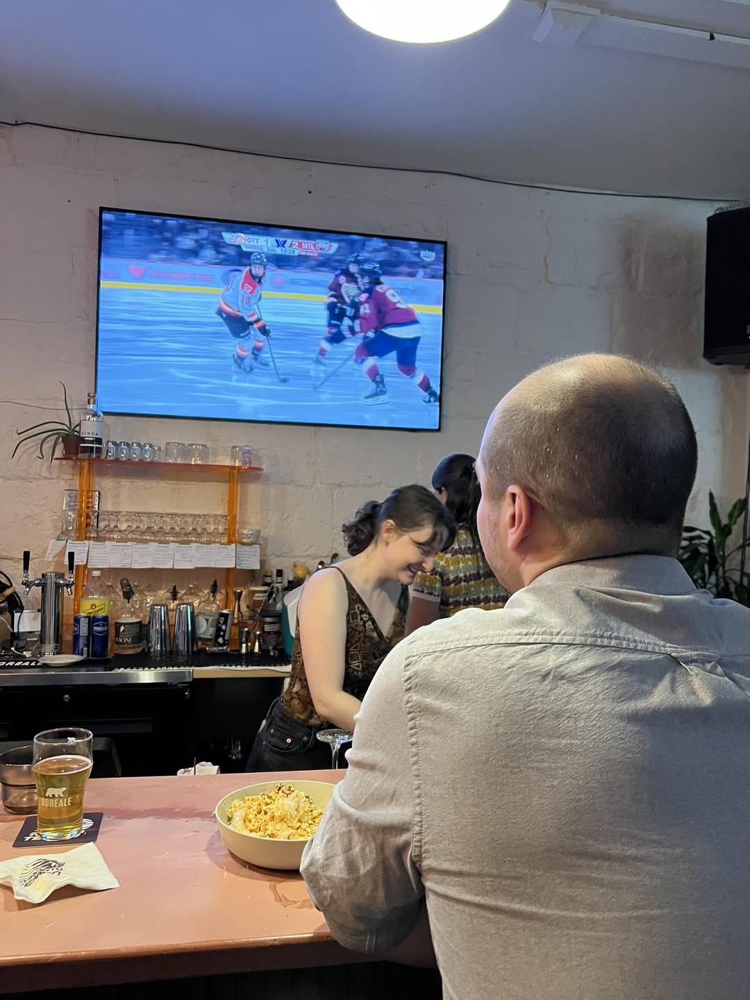 On a de la misère à voir la télé même derrière le comptoir. Tu parles d’un bar sportif.