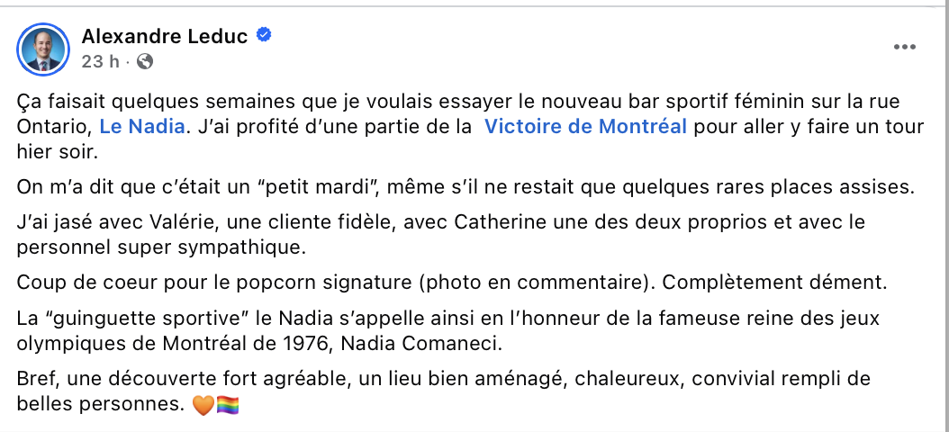 T’as raison, un bar qui présente juste des sports de femmes c’est pas scandaleux… mais c’est plate en esti par exemple.