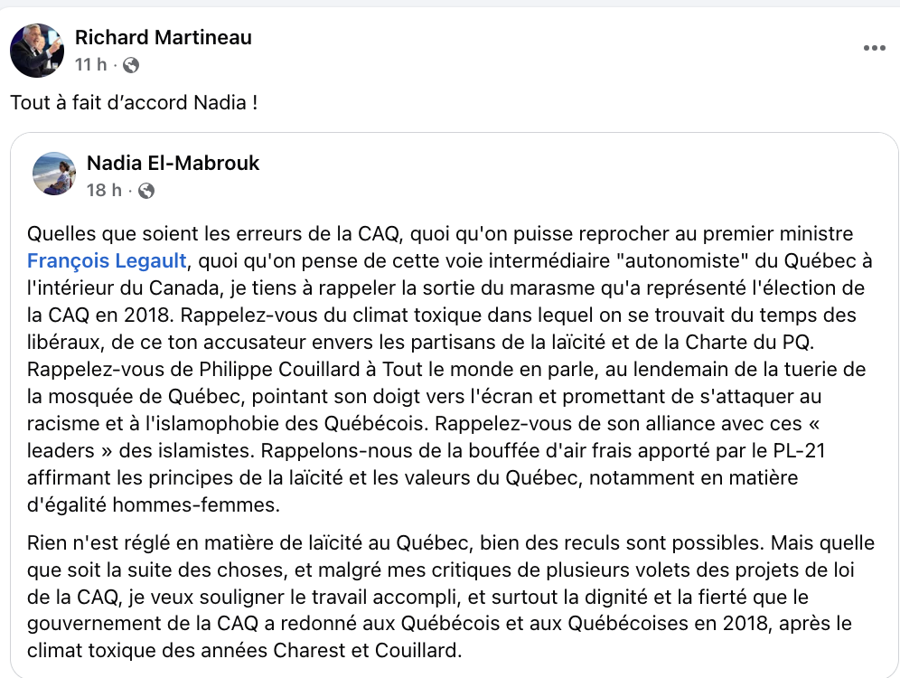 J’approuve aussi. On va dans le bon sens, mais un recul est toujours possible, surtout si le PLQ ou, pire encore, les islamo-gauchistes de QS, prennent le pouvoir,