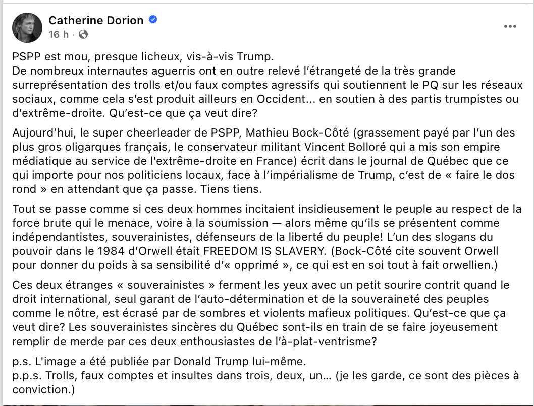 Catherine Dorion n’a pas la prestance intellectuelle requise pour se mesure à MBC et/ou PSPP. C’est une petite écervelée qui vit d’indignation ciblée. Son passage à l’Assemblée Nationale a été une nuisance.