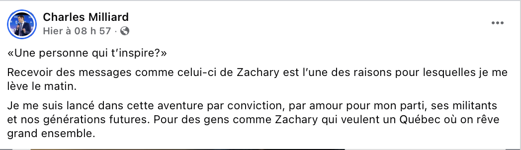 Quelle misère pour le parti libéral d’avoir un chef qui est est l’image du parfait vendeur de rêves. Son discours est vide comme celui de son prédécesseur Pablo. Il refuse de se prononcer sur le défense du français et la laïcité. Un parfait défenseur du bilinguisme pour les anglophones de Montréal. Un autre serviteur des corrompus.