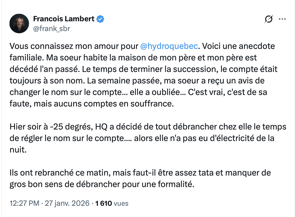 Ça me surprendrait en tabarnak qu’Hydro aille couper le courant en plein hiver volontairement en période de grand froid.