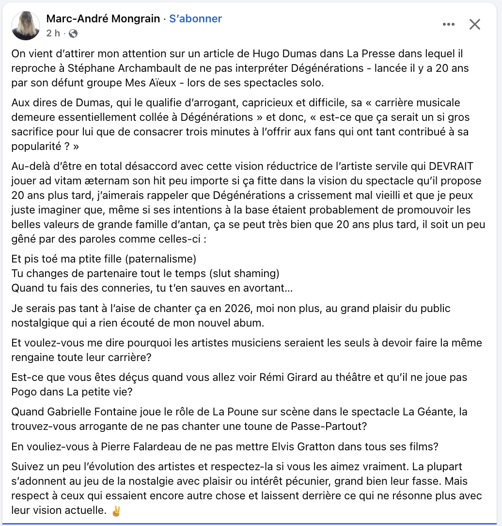 À cause d’une phrase dans un couplet, ce groupe passe pour extrême droite pour les gauchistes mais dans le fond Mes Aïeux, c’est des artistes de gauche à fond comme genre Tricot Machine. Ridicule!