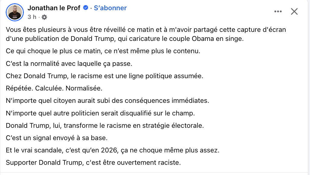 La réalité c’est qu’il vas se passer absolument rien. Quand on te nomme à 32 000 reprise dans les Epstein Files, que y’a des courriels de toi qui écrit à ton bon amis : « C’était génial sur ton île, celle qui était la plus jeune était vraiment la plus cochonne » et que malgré tout, y’a aucun mouvement social ou politique sur ton dos. Un vidéo ou une photo pour rire d’Obama et comparer les noirs à des singes, c’est rien. On n’en parleras plus demain.