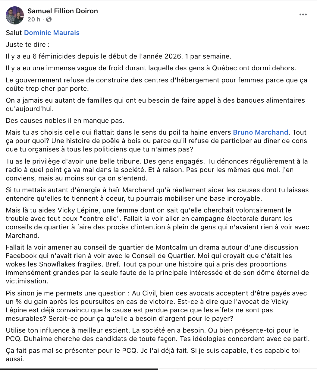 Au lieu de perdre ton temps à essayer de changer Maurais, et il s’en crisse totalement de toi, je t’invite à héberger une femme battue et ses enfants, et de changer ton salon en refuge par grand froid.