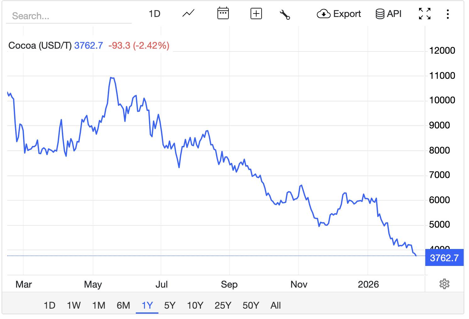 « Les prix du cacao se négocient autour de 3 800 $ la tonne, le niveau le plus bas depuis octobre 2023, alors que le marché équilibre une demande mondiale faible face à une offre accrue. Un faible intérêt d’achat entraîne une accumulation de stocks parmi les principaux producteurs de cacao, en particulier la Côte d’Ivoire et le Ghana »