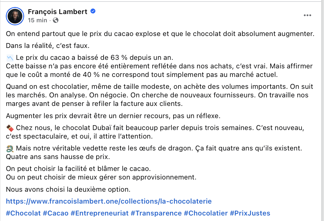Il n’a peut-être pas augmenter le prix de son chocolat même si le cacao a vraiment augmenter pour une raison bien simple : dès le départ, il a vendu son chocolat très cher pour avoir une marge de bénéfice plus importante. C’est bien qu’il vienne l’admettre implicitement.