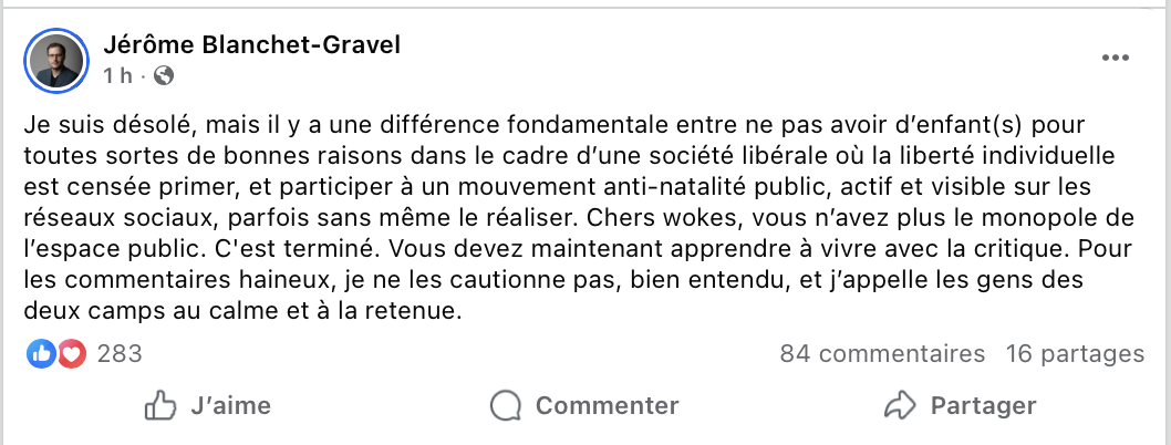 Reste que JBG a totalement raison dans son commentaire en bas. Se vanter volontairement de ne pas vouloir d’enfants est un synonyme de profond individualisme toxique pour la société.