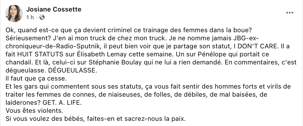 Bon, Josiane est fâchée. Ça fait changement, nos féministes toxiques sont jamais fâchées.