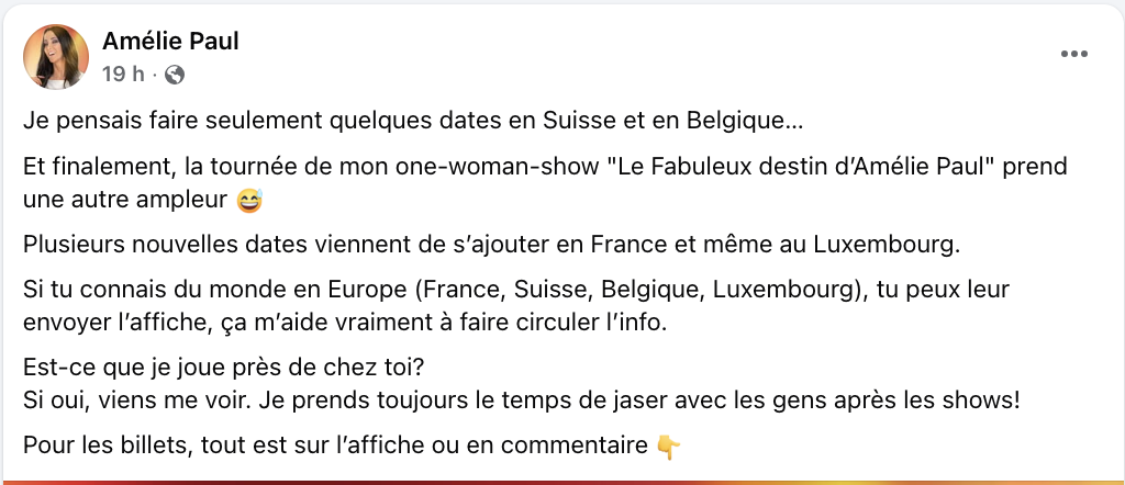 – Amélie Paul fait une tournée internationale mon gars, toi aussi t’es capable de faire ce que tu veux dans la vie.