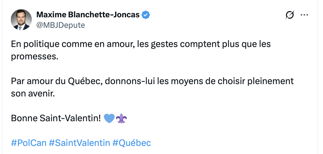 Quand l’obsession de certains souverainistes pour l’indépendance bascule dans le trouble mental, ça donne ça. C’est la Saint-Valentin, bout de viarge! Vous aurez 364 autres jours pour parler d’indépendance…