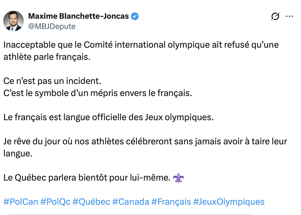Voilà ce qui arrive quand on n’existe pas sur la scène internationale. Le CIO s’est dit: « un Canadien ça parle anglais, faque tu vas parler anglais »