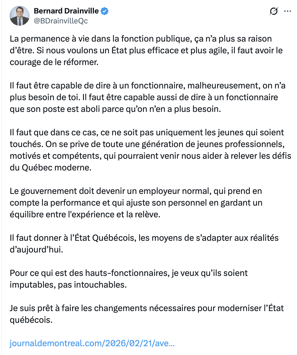 Les fonctionnaires, cest comme les gestionnaires du réseau de la santé ou de l’éducation. Jamais personne de responsable de rien. Un tuyau coule dans une école ? C’est le sous investissement, on ne questionnera jamais de dg immobilisations du css…