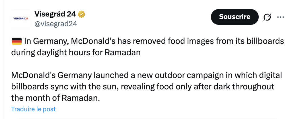 Excellente idée de McDo pour le ramadan! Les fragiles vont détester cependant! Commentaire inutile à m’envoyer: pommes frites? Navigation des articles ← Mère de 3 enfants, Onlyfans et pas une lumière… Le trailer d’un film d’horreur québécois écrit par India Desjardins! → Label Nom* E-mail Label Nom* E-mail 4 Commentaires Commentaires en ligne Afficher tous les commentaires Wysiwyg 1 heure il y a Et pourtant, lorsqu’on évoque l’islamisation progressive de la société occidentale, les accusations d’islamophobie et de repli sur soi se multiplient aussitôt. CrackPot 1 heure il y a J’aurais placé un voile sur les frites moi. Colargol le petit ourson 30 minutes il y a Oui, l’Occident a bel et bien perdu la tête. La tête au-dessus du bol 18 minutes il y a Répondre à Colargol le petit ourson Faire perdre la tête aux gens, c’était la spécialité d’ISIS…