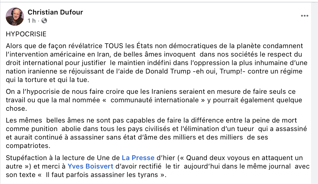 Vive le Canada, vive Donald et mes condoléances à la famille ainsi qu’aux proches du très regretté Guide suprême iranien, Ali Khamenei.