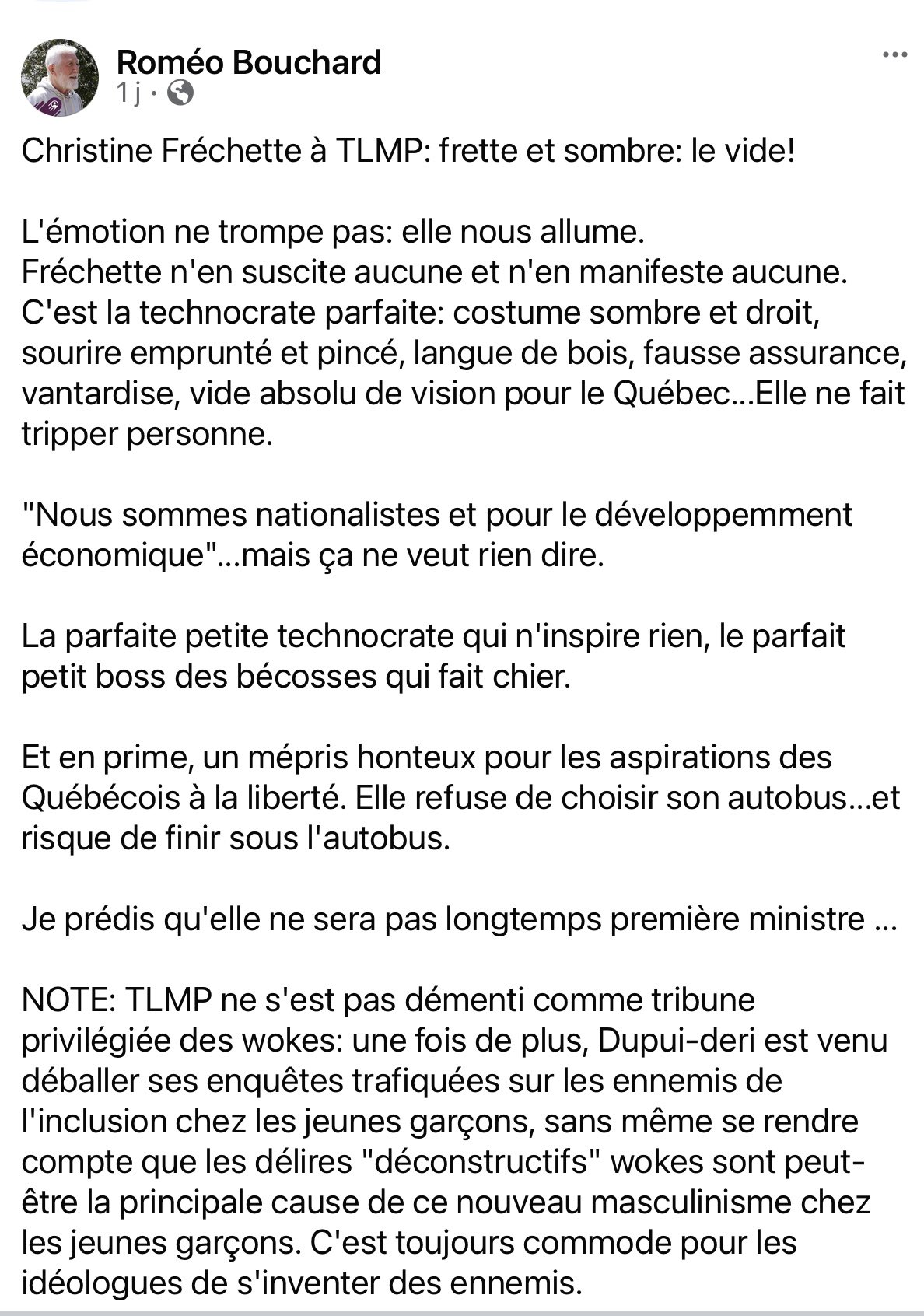 Il a raison, mais ça n’empêchera pas les médias nos idiots habituels d’être en pâmoison devant Fréchette quand elle sera évidemment élu chef et assermenté première ministre.