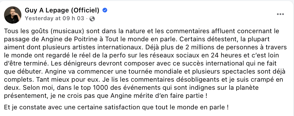 Sur YT au nombre de vidéos « Réaction », de musiciens amateurs ou pros qui tentent jouer leur musique et les commentaires positifs sur toutes ces pages, Angine de poitrine est le buzz actuel. C’est ici au Québec que l’on leur chie dessus. Peuple de minable.
