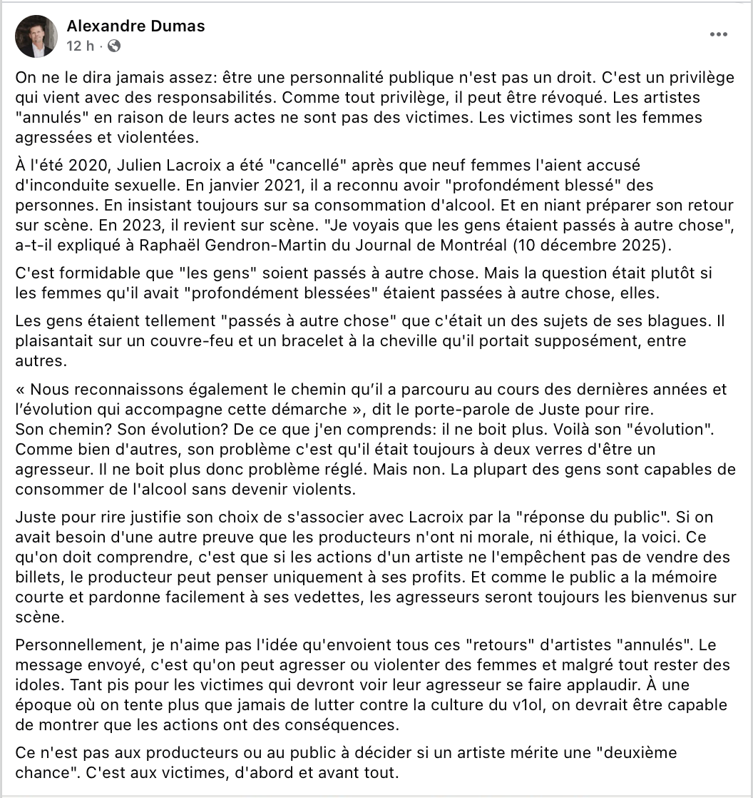 Les Québécois se réfugient dans les spectacles «d’humour», même ceux donnés par des «anciens» violeurs et agresseurs. L’humour est un refuge. Au lieu de s’impliquer et de changer la société, on va voir des spectacles d’humour.