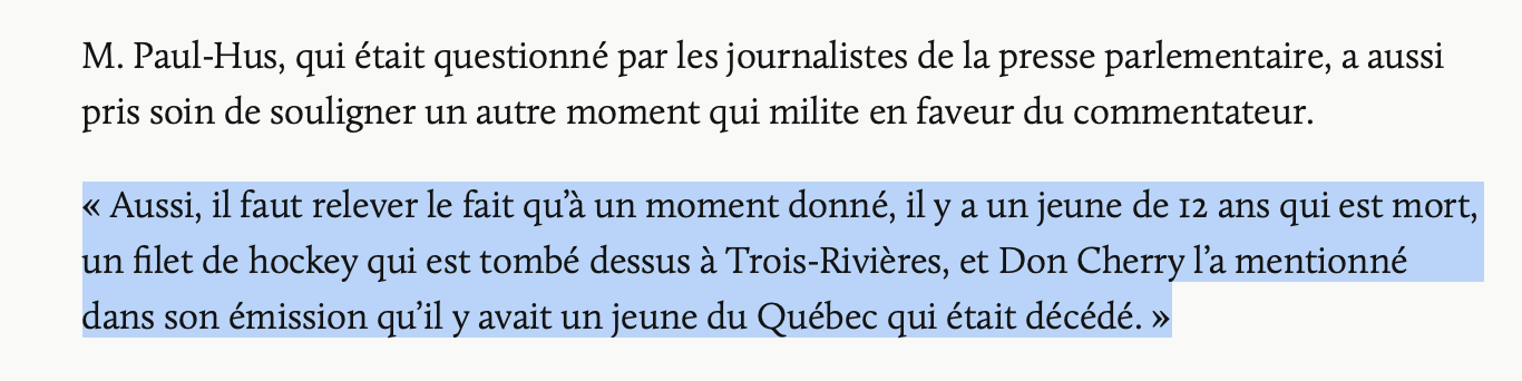 Ti-Clin Paul-Hus qui trouve du positif sur Don Cherry! 😂😂😂😂😂😂 Quel clown!!! 😂😂😂😂😂 Commentaire inutile à m’envoyer: ben quoi c’est positif! Navigation des articles ← Sylvain Parent-Bédard… t’es une Bi*** Label Nom* E-mail Label Nom* E-mail 16 Commentaires Commentaires en ligne Afficher tous les commentaires Drummond Power 3 heures il y a Chérie « l’amour du hockey rend aveugle, c’est pour ça qu’on touche à tout pour se rassurer…» Bienvenue à Castrapolis 1 heure il y a Répondre à Drummond Power Aie Clique, en es-tu rendu à empêcher les opposants des gauchiasses de… voter sur les commentaires ? Quoique… évidemment, c’est vendredi (et la stagiaire dogmatique de fin d’semaine est en poste) Pierre Paul-Hus-et-Coutumes 2 heures il y a Un jour, j’ai vu mon cher Don avec un coquelicot et ça m’a rappelé que les rives côtières du nord du Nouveau–Brunswick, où il est permis de pêcher les coques, s’amenuisent d’année en année comme peau de chagrin. Ça m’a attristé et j’ai dû me gratter jusqu’au sang par respect pour mon beau grand Canada.  Dudu 1 heure il y a Répondre à Pierre Paul-Hus-et-Coutumes Où ça, de la pêche aux cocks? Dave M. 2 heures il y a Hey gang, moé itou j’èmerè awouère l’Ordre du Canada. Come me l,a rapeulé Bergie, j,é faite raigner l’ordre su la patinouère et joué un matche avec mes montreal canadians en 2000. Pis, on me woué à tv pou’le hockey come Don Cherry. Faque, 1 + 1 = 8 Absolument personne 1 heure il y a Répondre à Dave M. J’ai jamais autant rit depuis La Cloche et l’idiot. Les pires moments de Trudeau-Landry 2 heures il y a Jé: Les deux Pierre ont raison: Poilievre et Paul-Hus même s’ils donnent du gaz aux péquistes et au mouvement des séparatissses. Jo: Ouin! Jé: Don, c’était une vraie carte de mode, faut pas l’oublier. Jo: C’est Don qui m’a rendu addict au Cherry Blossom. Jé: Une icône canadienne parmi tant d’autres,.. Jo: Je n’ai toujours pas digéré la fin de la fabrication d’une cerise au marasquin enrobée de sirop, de noix de coco et d’arachides dans une boule de chocolat très sucrée. Jé: Un an déjà et quel triste souvenir. Jo; entouka, dans mon livre à moué, l’Ordre du Canada à Don Cherry, c’est un must. Jé: j’veux pas m’en mêler, mais je vais profiter des ondes et de l’antenne de la très fédéraliste CogeCon pour mousser jour après jour cette nomination. Jo: Jé, je t’aime! . Bofff 1 heure il y a En terme de colonisé qui fait des pirouettes pour justifier l’injustifiable, les conservateurs québécois qui militent au sein du PCC sont dans une classe à part. Réjean Labrie 1 heure il y a Répondre à Bofff Je ne donne pas ma place non plus comme colonisé. Le paillis en 2026! Libérée 56 minutes il y a Répondre à Bofff Et les libéraux fédéraux et provinciaux, même chose. Pedro 9 minutes il y a Répondre à Bofff Pierre Paul-Hus est effectivement dans une classe à part côté ti-clin. Certains ont plus d’allure, comme Deltell. Il est très cultivé, de droite fiscale mais socialement au centre, capable de bien communiquer. Il assume son fédéralisme même si parfois ça lui demande certaines contorsions. Allez savoir pourquoi Poilievre préfère Paul-Hus. Mépris équivalent 1 heure il y a Don Cherry, c’est Antipékistanais. Lorem Ipsum 1 heure il y a Les conservateurs sont passés maîtres dans l’art sublime du sabotage politique, semblant presque terrifiés à l’idée de remporter une élection. C’est du génie pur. L’exemple de ce bon vieux « Rhodésien » Don Cherry illustre parfaitement leur talent pour l’autodestruction. Sincèrement, laissons Cherry accumuler de la poussière dans son garde-robe. Après tout, on peut bien asperger une crotte de Chanel n° 5, elle ne finira jamais par sentir la rose. Libérée 55 minutes il y a Répondre à Lorem Ipsum Il a 92 ans, son temps rétrécit Un gars offusqué 33 minutes il y a Moi la dernière fois que j’ai été autant outré, c’est quand le Macleans avait dit qu’on était une province corrompue!! L Expert 29 minutes il y a PPH est un pur idiot , j aimerais bien voir les z artistes et personnalités franco qui ont déjà reçu l ordre du canada la remettre au gouverneur en guise de protestation. Mais ça n arrive pas … trop cons et colonisés
