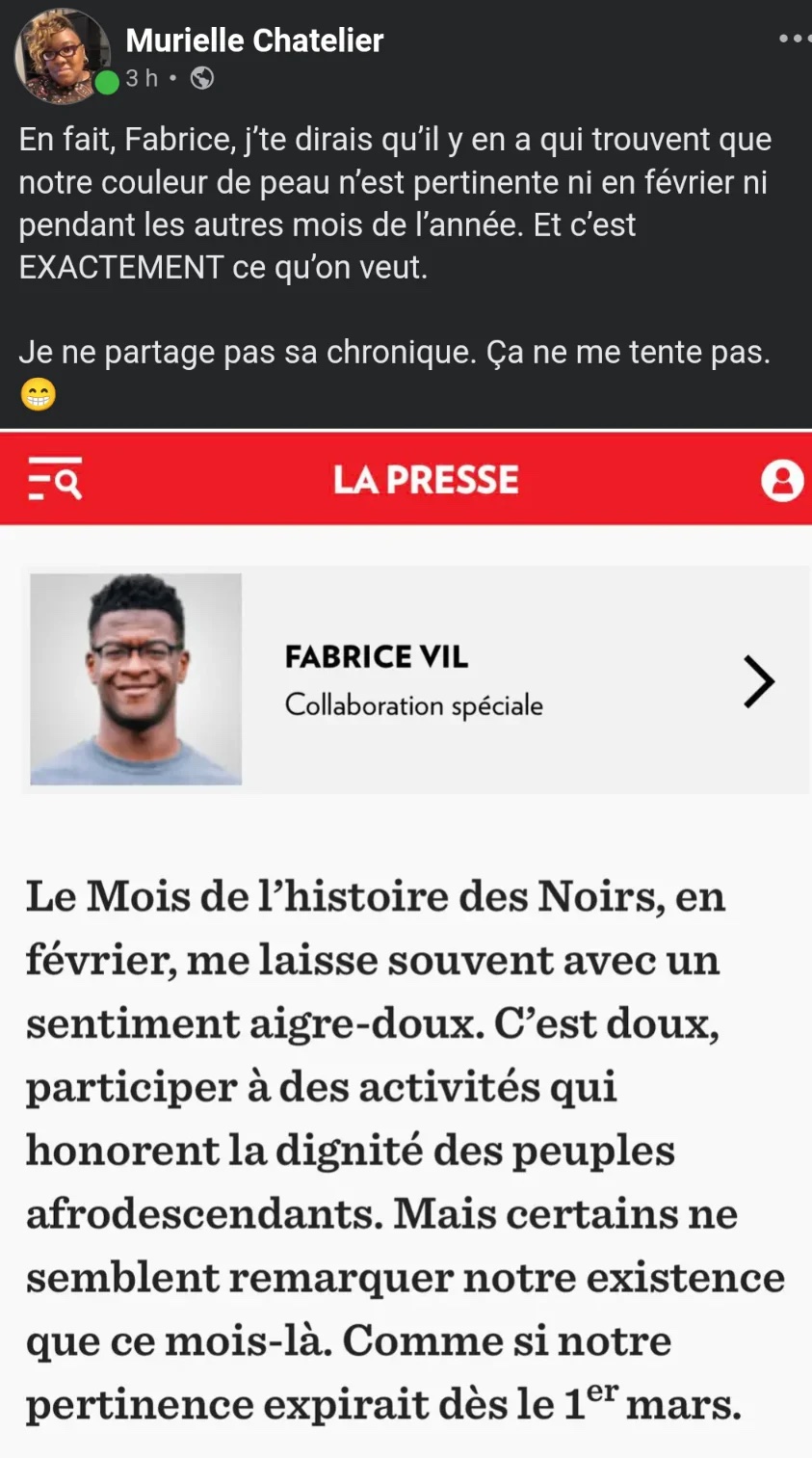 L’histoire des noirs, on l’a partout dans les journaux, tribunaux et vidéos sur le net ! Comme à Repentigny, j’en ai assez vu, rien de bien intéressant et constructif, merci, continuez de vous plaindre….