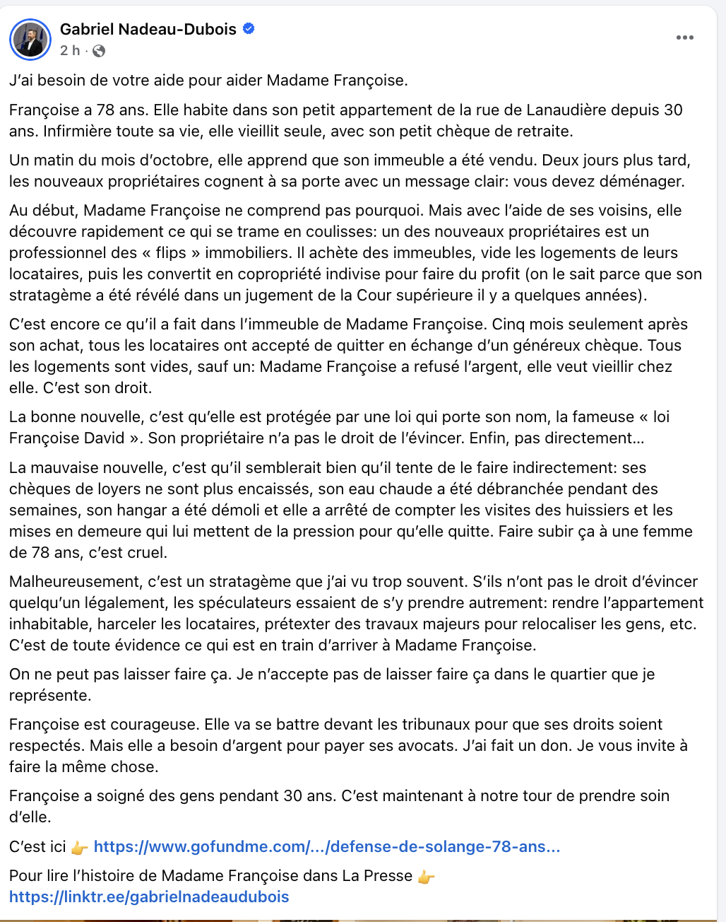 Françoise a soigné des gens…quelle phrase idiote. Françoise a fait son travail pour lequel elle recevait une rémunération comme tout travailleur. Françoise semble une électrice de Québec solidaire puisqu’elle porte encore son petit masque. Peut-être est-ce à la demande de GND celui là même qui voulait envoyer des brigades vaccinales dans les chaumières québécoise? N’empêche que le nouveau proprio de Françoise est un beau trou d’cul.