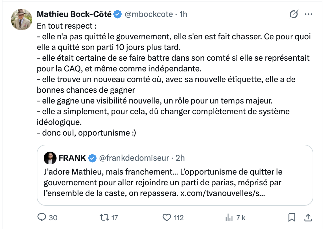 C’est vrai qu’il s’agit d’opportunisme, on va pas se le cacher. Ceci dit, c’est aussi vrai que MBC ne voit les choses qu’à travers ses lunettes de péquiste.