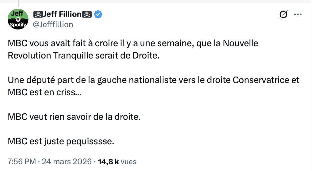 Et Fillion n’aime pas qu’on souligne que Maité est une loser opportuniste. Pas cette fois-ci! Si ça se passait au PQ, Jeff serait probablement outré.