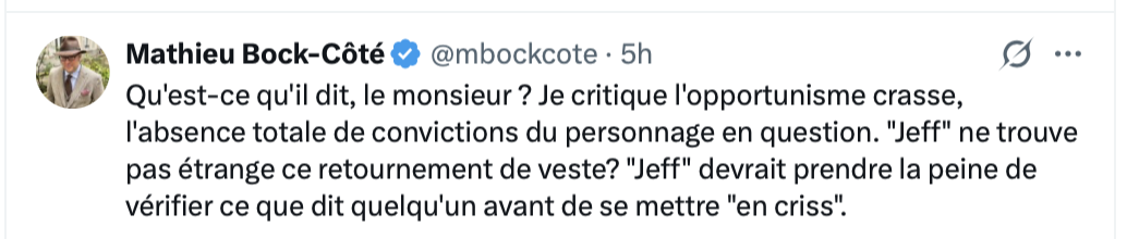 Jeff est de mauvaise foi et vieillit mal. Il pense que de mettre un «criss» dans ses tweets va lui donner un air crédible. Jeff pense que de mettre un gros «ciboire» ou un gros «criss» ou le mot «péquisse» va renchérir sa pensée!