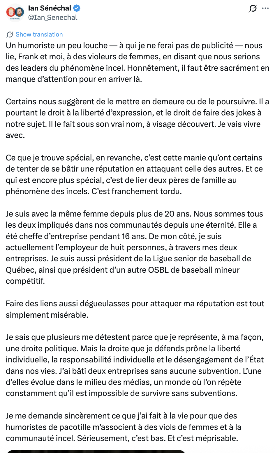 Personnellement, je suis étonnement avec la même femme qui est incapable de me supporter depuis tellement d’années et je suis l’employeur de plus de 750 personnes aux États-Unis grâce à ma dizaine de podcasts. Je suis aussi le président des trous de cul qui chient sur le Québec depuis la Floride, le grand chum de Réjean et de son cornet à deux boules et le principal de conseiller de Donald.